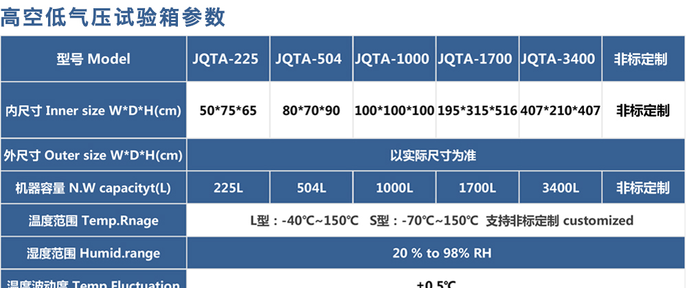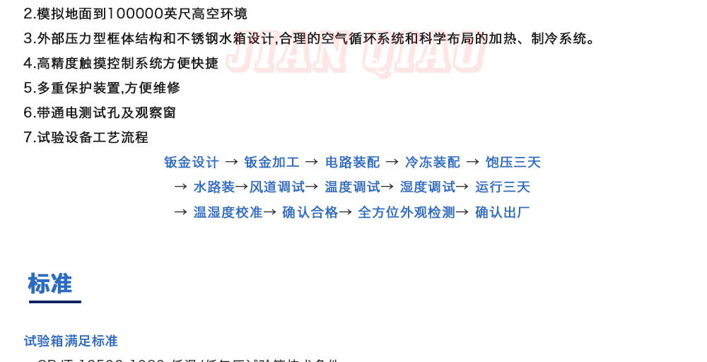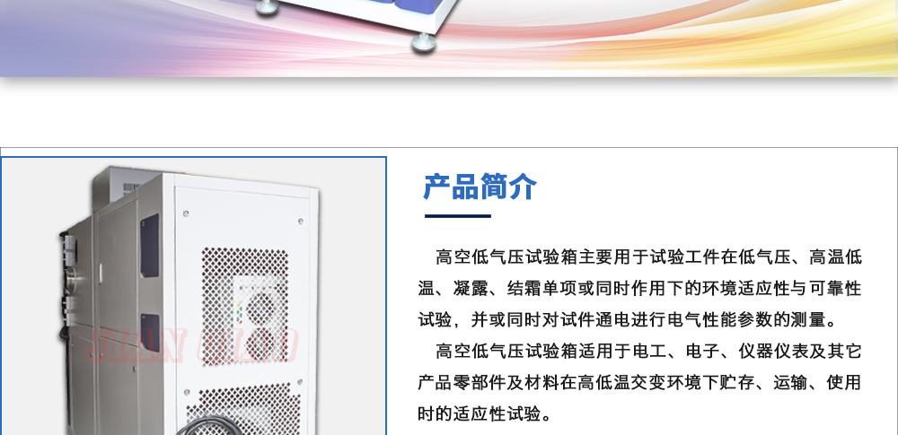 用途:高空低氣壓試驗箱主要用于試驗工件在低氣壓、高溫低溫、凝露、結(jié)霜單項或同時作用下的環(huán)境適應(yīng)性與可靠性試驗,并或同時對試件通電進行電氣性能參數(shù)的測量。高空低氣壓試驗箱