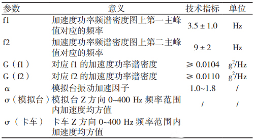 模擬運輸臺的設計參數(shù)主要依據(jù)《QJ/T 815.2-94產(chǎn)品公路運輸加速模擬試驗方法》[3]設定。該標準中規(guī)定了模擬運輸臺的關鍵技術指標,見表1。